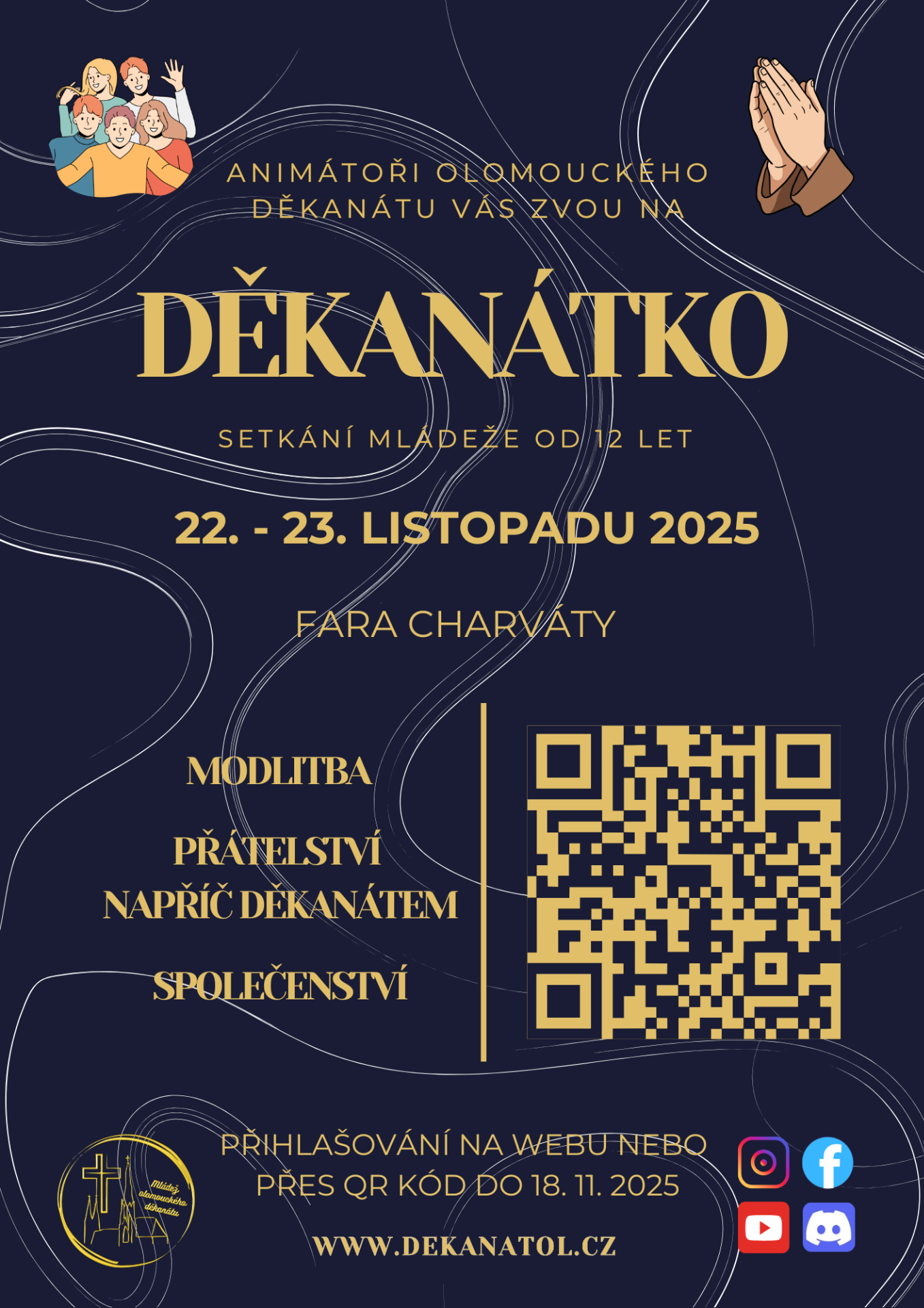 V listopadu na výročí světových dnů mládeže pořádáme děkanátní setkání mládeže. Akce se koná na faře v Charvátech ve dnech 22. - 23. 11. 2025 pro mladé od 12 let. Registrace začíná v jednu hodinu odpolední. Pro účastníky je zajištěn zábavný duchovní program s přespáním a občerstvením. Naší snahou je se společně připravit na následující Adventní dobu.