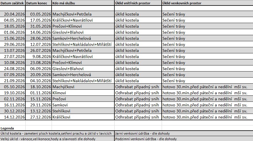 Rozpis služeb úklidu kostela a údržby vnějších prostor kostela